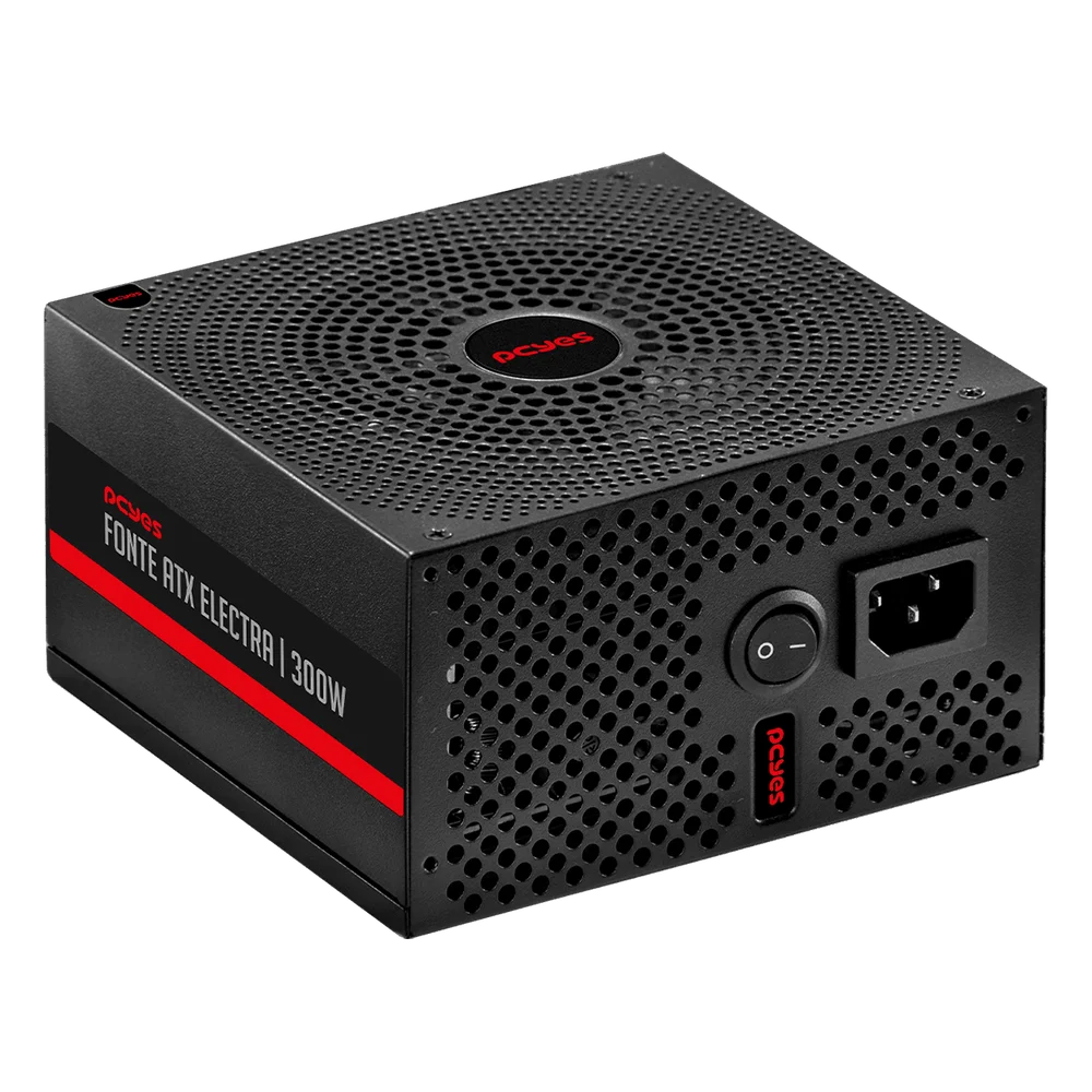 ESPECIFICAÇÕES Potencia: 300W Tensão de Entrada: Full Range 100-240V Fan: 12cm preto com controle térmico PFC Ativo Filtro EMI: 2 grade on PCBoard Dissipador de calor